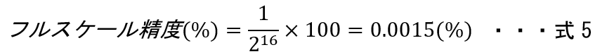 センサーから出力された信号は、A/D変換回路で量子化(数値化)されます。この数値を一定の周期で読み取り、読み取ったデータ(入力電圧値)は時系列で保存されます。弊社のA/D変換の精度は16bitで行われます。フルスケール精度(数値化誤差)を式5で表します。